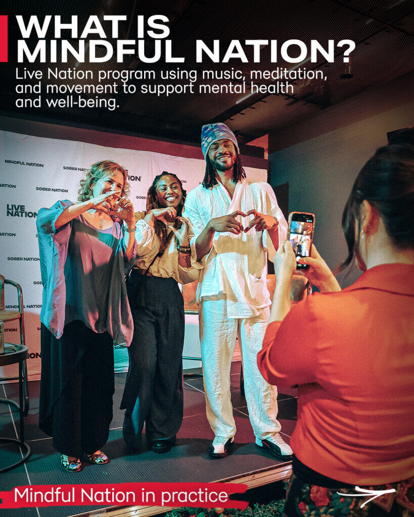 Live Nation employees can access Mindful Nation anywhere through the app, featuring 1,000+ wellness classes, global music playlists, and “Breathe with the Beat” guided exercises.