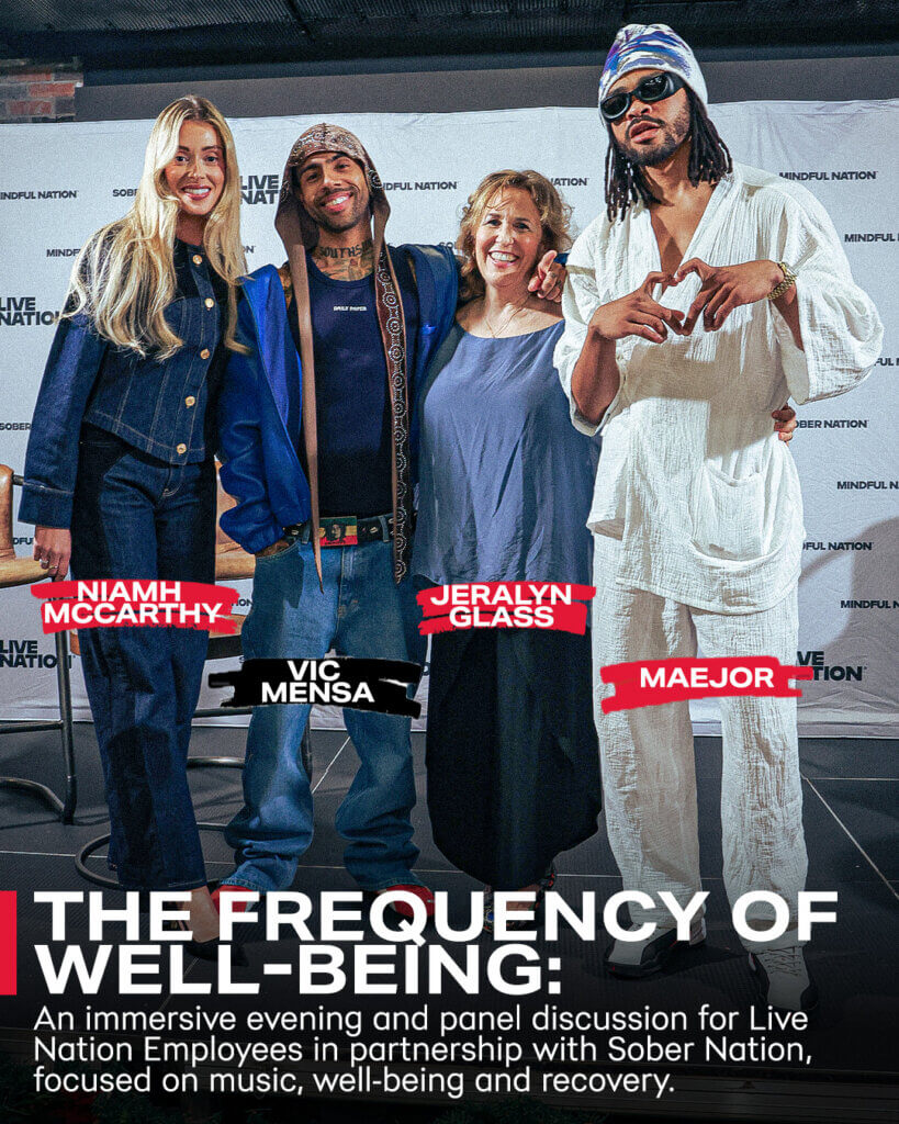 Mindful Nation, Live Nation’s employee mental health and well-being program, partnered with Sober Nation, an employee community dedicated to destigmatizing sobriety and fostering inclusive spaces across the music industry, to host The Frequency of Well-Being, a conversation on resetting and renewal featuring Maejor, Vic Mensa, and others.