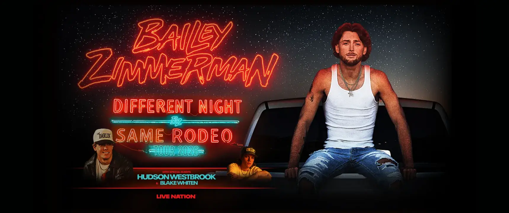 Multi-platinum country superstar Bailey Zimmerman is thrilled to announce the dates for his 2026 Different Night Same Rodeo Tour, kicking off in Estero, FL on February 19 and making stops in Knoxville, Boston, Atlanta, Fort Worth, Nashville, Toronto, and more before wrapping in Ottawa, ON on June 20. Following his sold-out headline trek for his New To Country Tour, Zimmerman will continue to electrify audiences as he brings his dynamic live show to 30+ venues across the US and Canada, promoted by Live Nation and featuring support from Hudson Westbrook and Blake Whiten.
