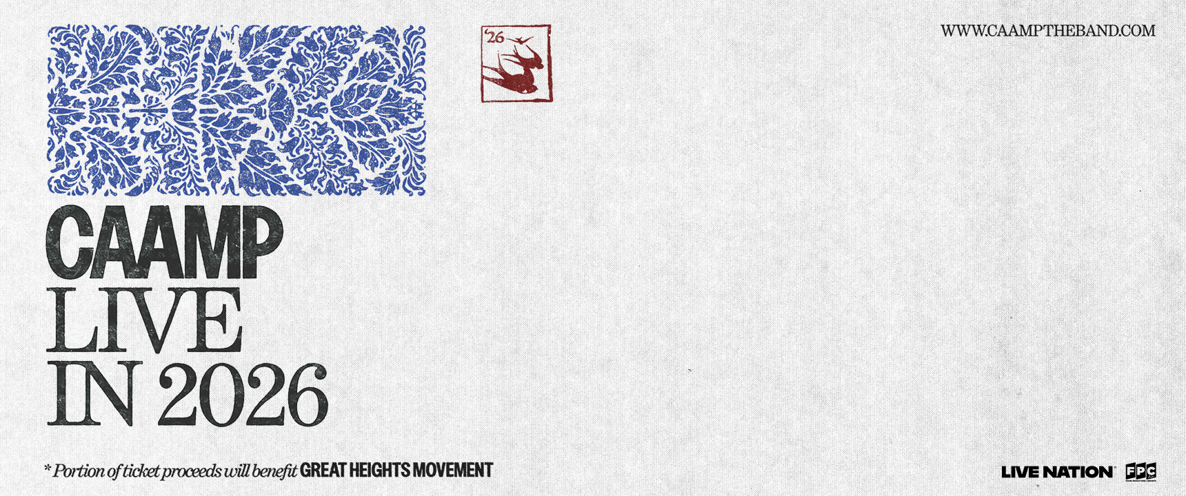 Artist pre-sale begins February 17th at 10am local time with additional pre-sales running throughout the week ahead of the general on-sale which begins February 20th at 10am local time. Caamp will donate $1 for each ticket sold to their Great Heights Movement, which supports charitable programs in the Columbus, OH area and beyond. Fans can learn more and register for the pre-sale code now at: caamptheband.com/caamp-tour-dates