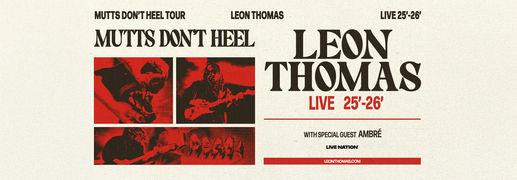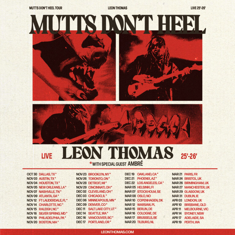 GRAMMY Award-winning artist Leon Thomas announces his MUTTS DON’T HEEL World Tour, produced by Live Nation, in support of HEEL, the deluxe edition of his critically acclaimed sophomore album MUTT, out now via EZMNY/Motown Records. The North American leg kicks off October 30 in Dallas, TX, with stops in Austin, Nashville, Atlanta, Brooklyn, Toronto, Chicago, and Los Angeles. Rising R&B standout Ambré will join as support across the U.S. and Canada. Tickets will be available starting with an artist presale beginning Wednesday, June 11. Additional presales will run throughout the week ahead of the general on sale beginning Friday, June 13 at 10am local time at https://laylo.com/leonthomas/m/muttsdontheel.