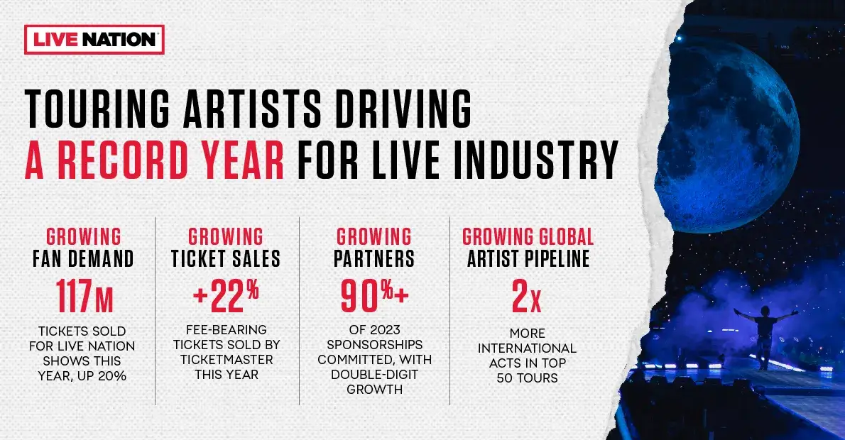 - Record number of fans expected: Over 117 million tickets sold year-to-date for Live Nation shows this year, up 20% year-over-year