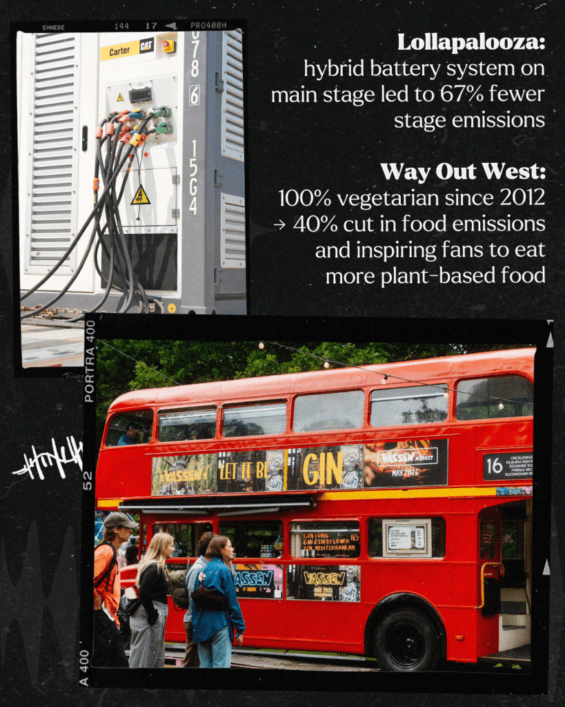 Large-format events and food choices offer outsized impact, as festivals drive disproportionate emissions and plant-forward menus could cut food-related emissions by 40%+