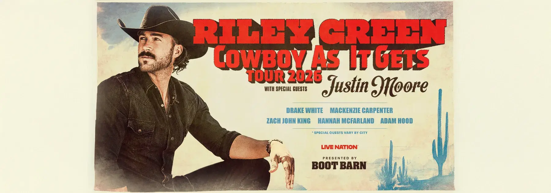 Today, multi-PLATINUM, ACM and CMA Award-winning singer-songwriter Riley Green announces his 2026 headlining Cowboy As It Gets Tour. Special guests will include Justin Moore, Drake White, Mackenzie Carpenter, Zach John King, Hannah McFarland and Adam Hood.