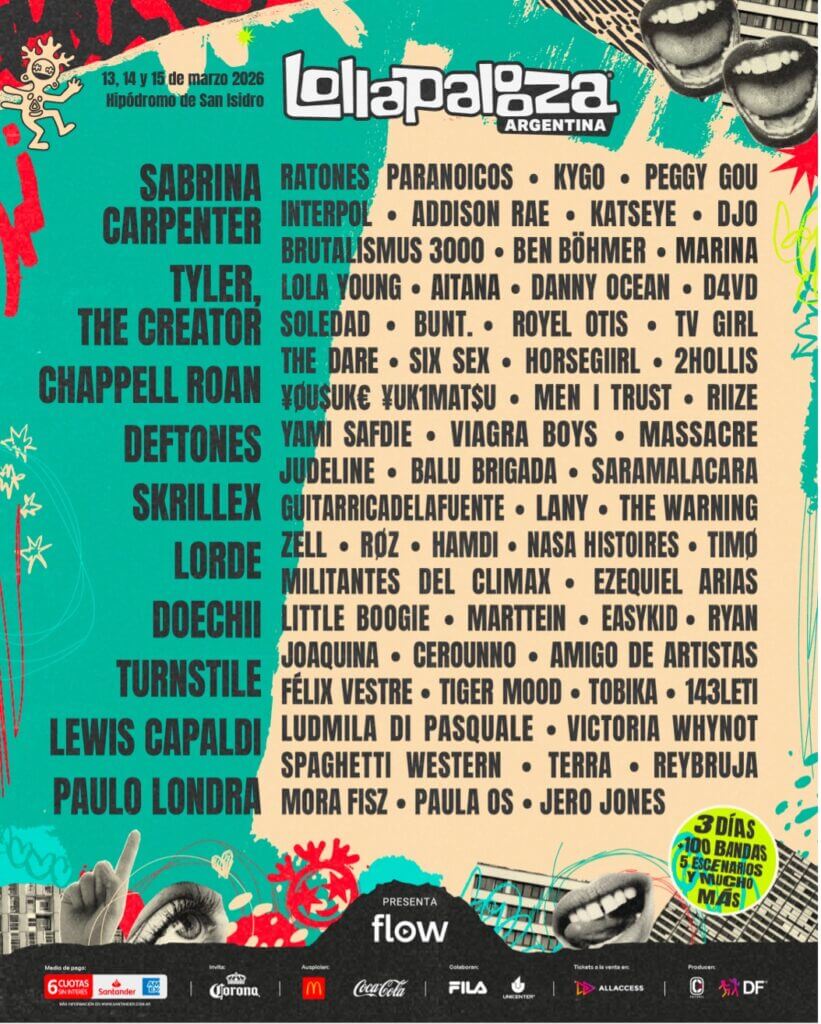 (August 28, 2025) Lollapalooza Chile, Lollapalooza Argentina and Lollapalooza Brasil have unveiled a powerhouse lineup for the 2026 editions, featuring headliners Sabrina Carpenter, Tyler, The Creator, Chappell Roan, Deftones, Skrillex, Lorde, Doechii, Turnstile and Lewis Capaldi. The diverse array of artists performing also includes Interpol, Kygo, Peggy Gou, Brutalismus 3000, Addison Rae, Katseye, Marina, Djo, TV Girl, Royel Otis, RIIZE, and many more. Tickets are available now.