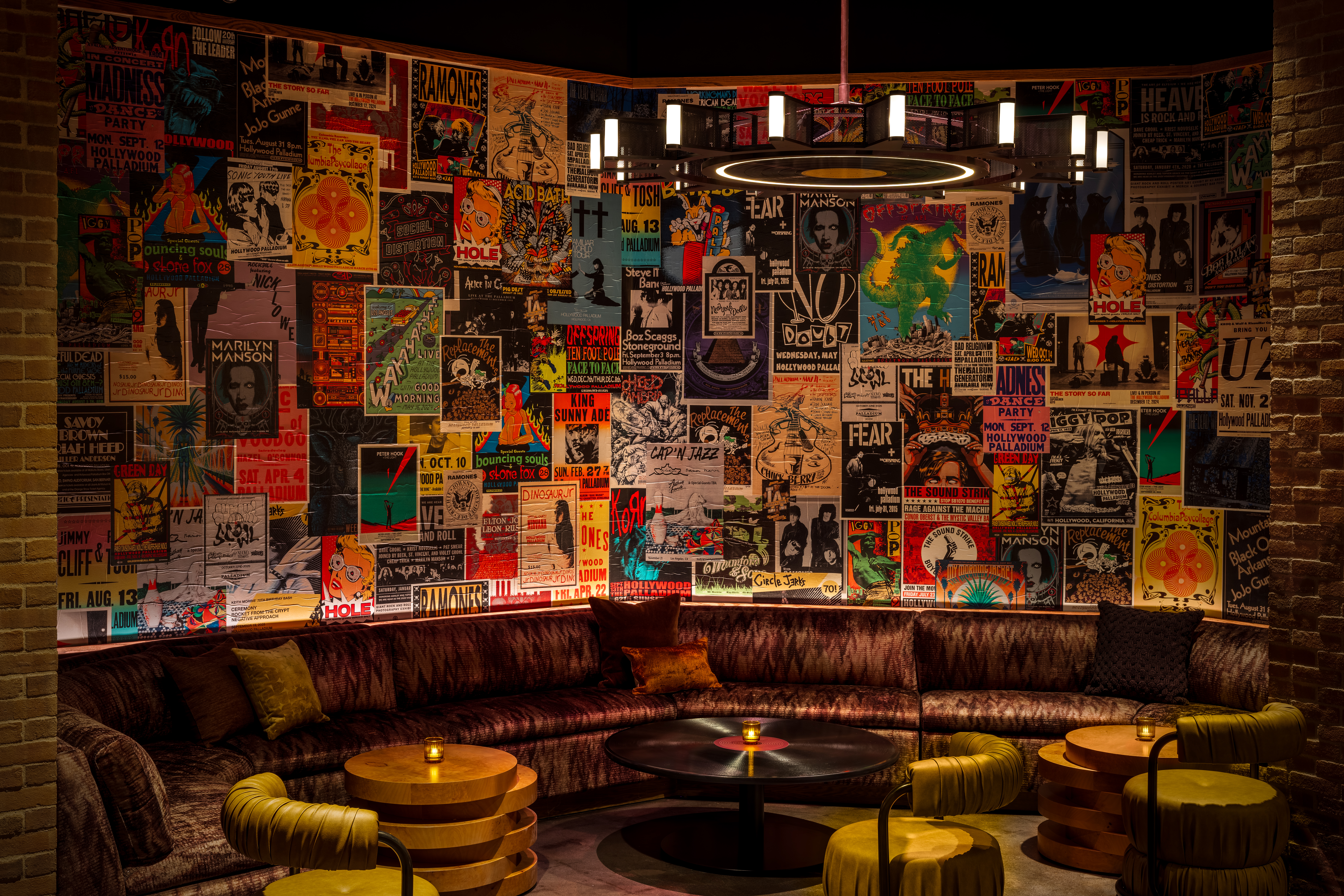 One of the most impactful design elements is the wheatpaste poster wall – a textured, layered installation that nods to Los Angeles’ live music culture. Wheatpaste posters have long been a fixture across the city – layered onto city walls, weathered by time, and replaced night after night in the lead-up to a show. At Vinyl Room, that tradition becomes a visual archive of the Palladium’s history, with posters spanning over eight decades of performances like The Who, Grateful Dead, U2, The Clash, Sonic Youth, Nirvana, No Doubt, The Ramones and many more.