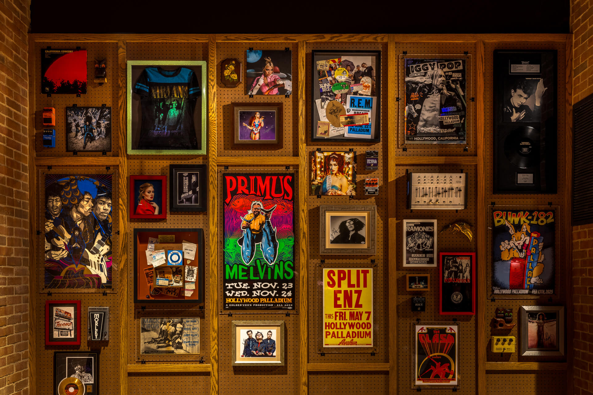 Designed with discovery in mind, the room rewards repeat visits with new finds, uncovered layers of history, and unexpected easter eggs. Framed show posters, signed vinyl records, and historic memorabilia highlight defining moments from the venue’s storied history, including a 1991 show poster from co-headliners Red Hot Chili Peppers and Beastie Boys and a Hollywood Palladium postcard signed by Lawrence Welk from the 1940s. Vintage audio equipment, like a 1970s Sony reel-to-reel and a Lafayette dynamic microphone, celebrates the golden era of analog sound.