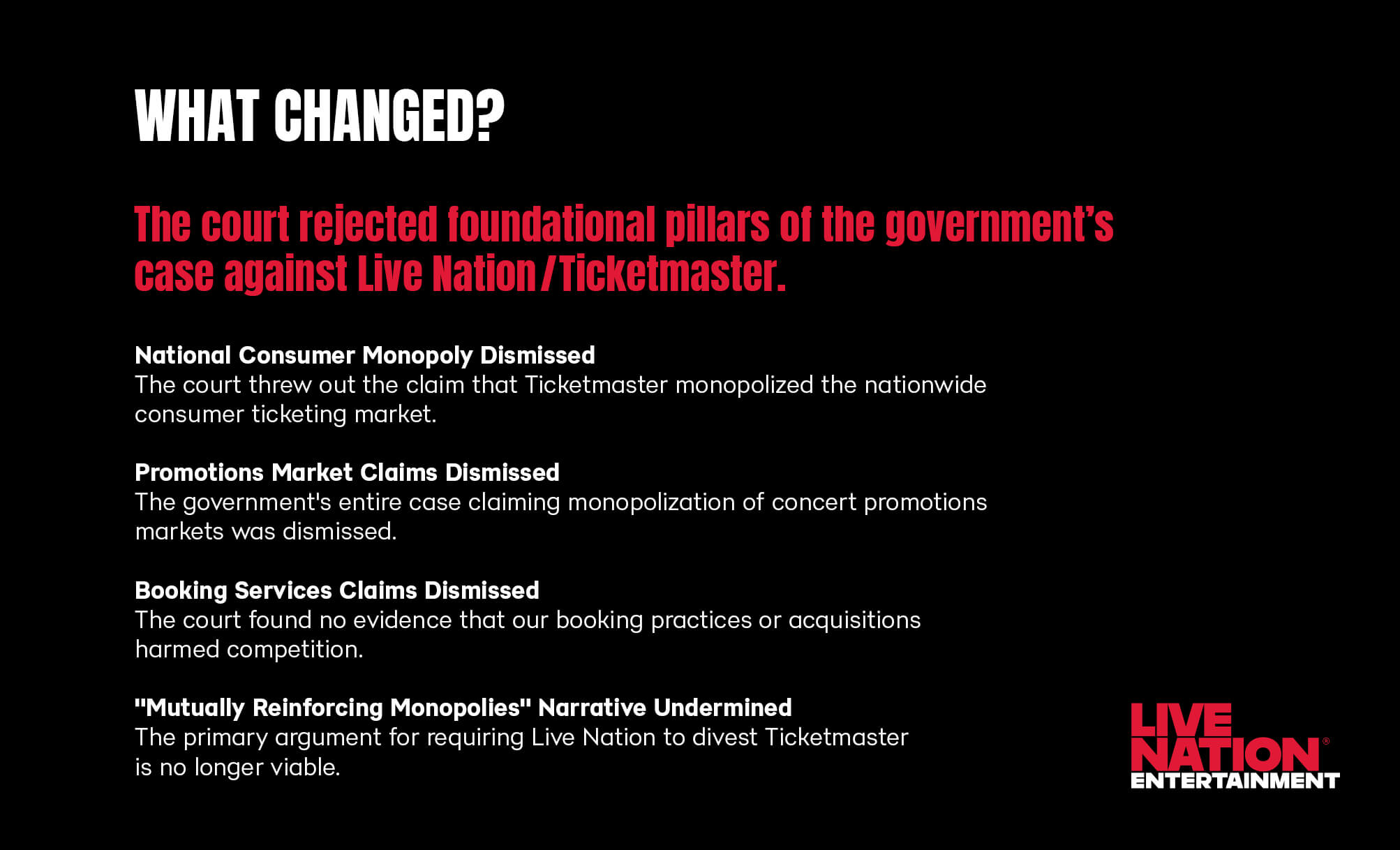 Cases in this posture nearly always settle, and with the prospect of structural relief off the table, that is what should happen in this case now. Live Nation is ready to make that happen with DOJ and any State Attorney General committed to realistic, common-sense solutions to the remaining issues. We understand that any settlement needs to be meaningful for our venue customers, for artists, and of course for fans. That is what we want, too. Despite the constant criticism we receive from some quarters, Live Nation and Ticketmaster have led the industry in promoting reforms that artists and fans care about. We hope and expect that a resolution of this case will extend those efforts.